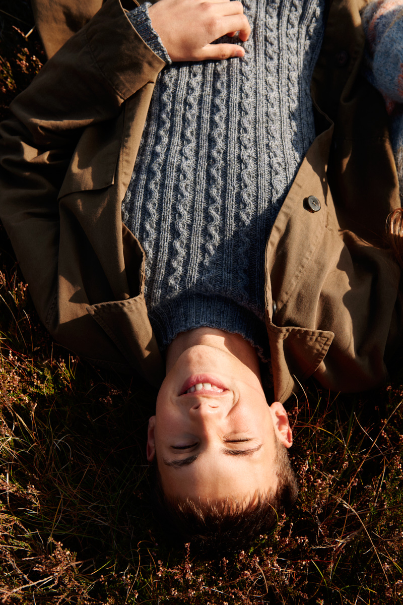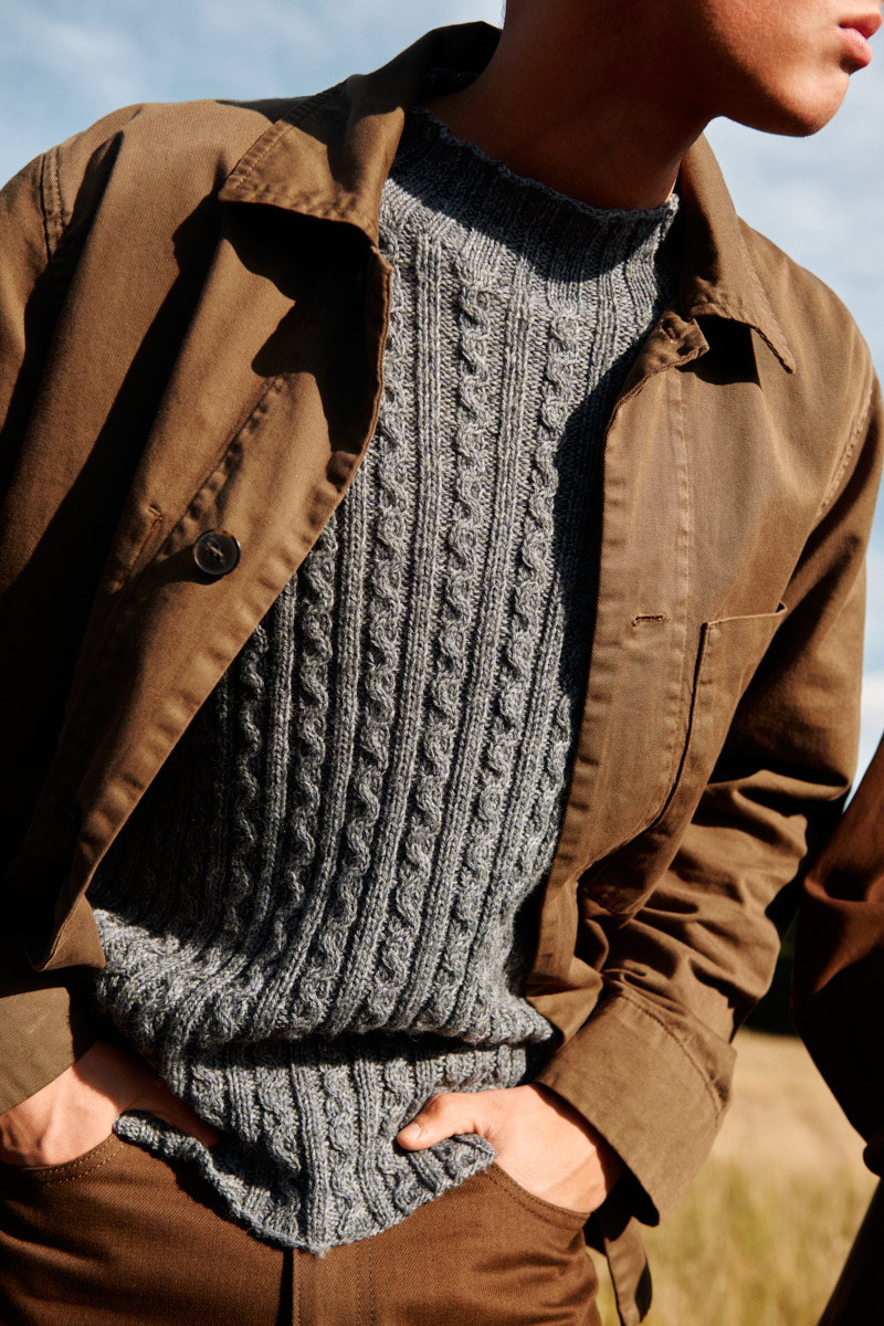 The sweater is knitted in Merilin and Trio 1 – yarn qualities that also appeal to men. That’s why I chose to incorporate Babette’s sinature cable into a clean, masculine design: Lyon.”