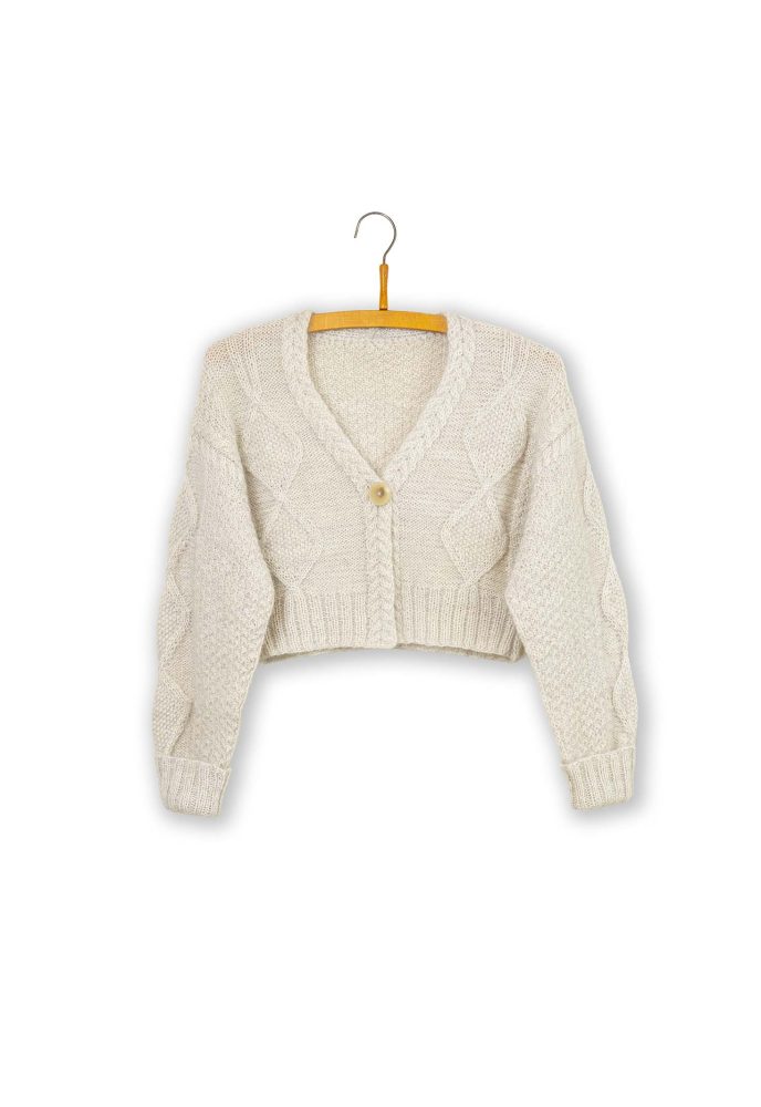 Cardiganen strikkes nedefra og op. Forstykker og ryg strikkes for sig. Der strikkes m op til tilsatte ærmer, som afsluttes med en bred ribkant, som kan ombukkes for at justere længden.